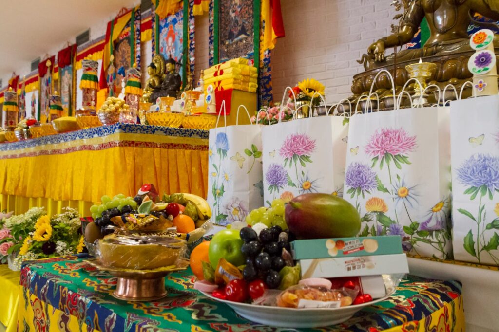 At the conclusion of the retreat, Rinpoche led the gathered sangha in the tshog offering to Guru Rinpoche, and the worldwide sangha also joined by live stream from their own homes in performing the ganachakra offering. With an array of vast offerings in shrine rooms spanning the world, the sangha practiced as one at the feet of the guru.