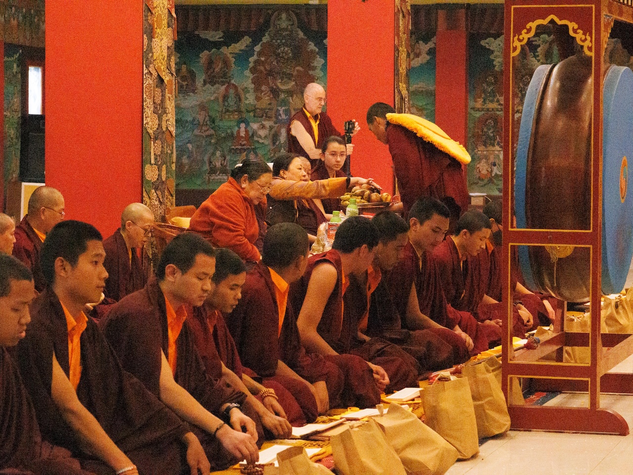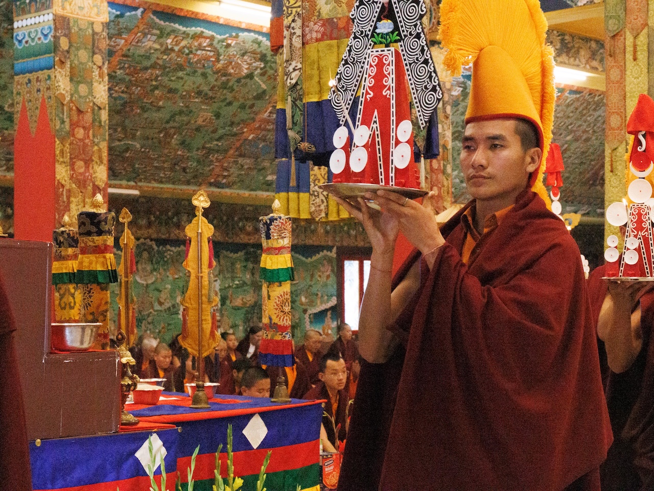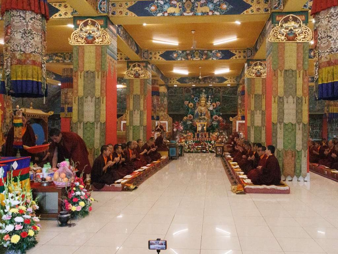 On the third day of Losar of the year of the Fire Horse, 2026, the sangha of Mindrolling gathered to make vast offerings of ganachakra (feast offerings) to mark the anniversary of the parinirvana of Kyabje Minling Trichen. The assembly was led by Minling Dungse Rinpoche and included Minling Jetsün Rinpoche, Minling Jetsün Khandro Rinpoche, Minling Jetsün Dechen Paldrön, Sangyum Kushog, Venerable Khentrul Marpa Rinpoche and the other Mindrolling tulkus, khenpos, and monks, as well as nuns of Samten Tse, and Mindrolling International sangha members. Many more sangha members who could not attend in person joined the practice on the internet by live stream. The entire assembly joined together with great devotion to accomplish the vast ganacakra.